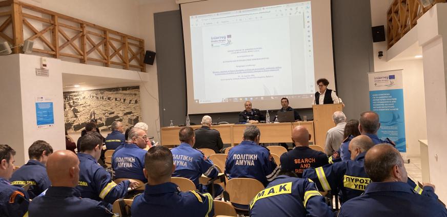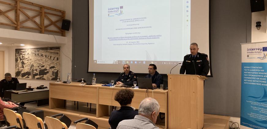 Στο πλαίσιο υλοποίησης του έργου με τίτλο “Κοινή Στρατηγική για τη διαχείριση και αντιμετώπιση κινδύνων που προκαλούνται από πλημμύρες και άλλες μεγάλες καταστροφές λόγω κλιματικών αλλαγών” και ακρωνύμιο “ΠΛΗΜΜΥΡΙΣ” του Προγράμματος Διασυνοριακής Συνεργασίας INTERREG VA - Ελλάδα – Κύπρος 2014-2020, διοργανώθηκε από την Αποκεντρωμένη Διοίκηση Κρήτης – Διεύθυνση Πολιτικής Προστασίας και πραγματοποιήθηκε 25 και 26 Απριλίου 2023 στο Ηράκλειο πρόγραμμα εκπαίδευσης 50 στελεχών με τη συμμετοχή εταίρων από την Πολιτική Άμυνα και την Πυροσβεστική Υπηρεσία Κύπρου καθώς και στελεχών της Περιφερειακής Διοίκησης Πυροσβεστικών Υπηρεσιών Κρήτης.