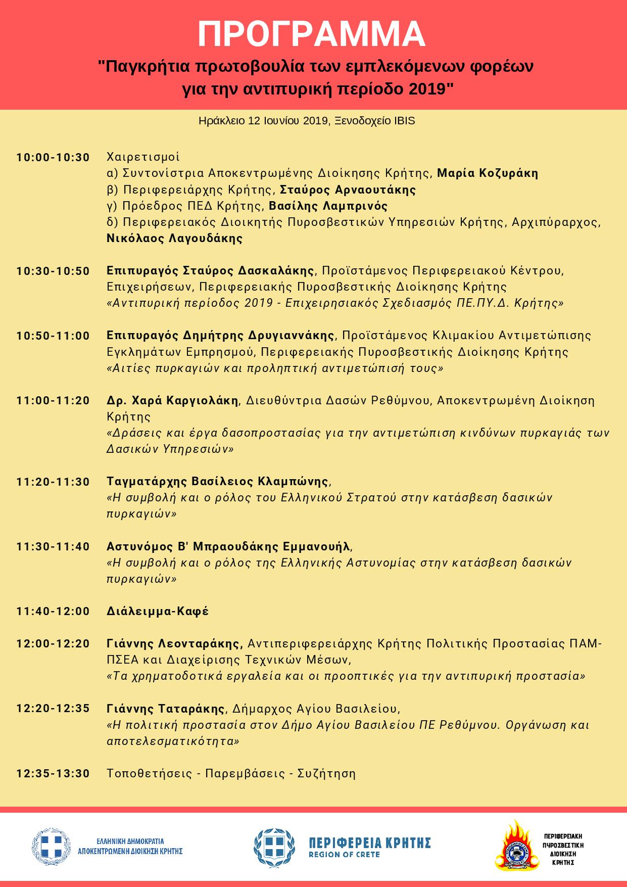 Η σύσκεψη θα πραγματοποιηθεί την Τετάρτη 12 Ιουνίου στο Ηράκλειο με συμμετοχή των συναρμόδιων υπηρεσιών, της Πυροσβεστικής Υπηρεσίας, των Δασικών Υπηρεσιών και της Πολιτικής Προστασίας της Αποκεντρωμένης Διοίκησης Κρήτης, της Περιφέρειας Κρήτης, όλων των Δήμων του νησιού καθώς και των Σωμάτων Ασφαλείας.