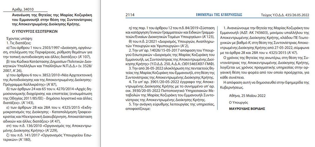 Με την αριθμ. 34010/25-5-2022 απόφαση (ΦΕΚ 435/26-5-2022 τ. Υ.Ο.Δ.Δ.) του Υπουργού Εσωτερικών κ. Μαυρουδή Βορίδη, ανανεώθηκε η θητεία της Μαρίας Κοζυράκη στη θέση της Συντονίστριας της Αποκεντρωμένης Διοίκησης Κρήτης. Εικόνα