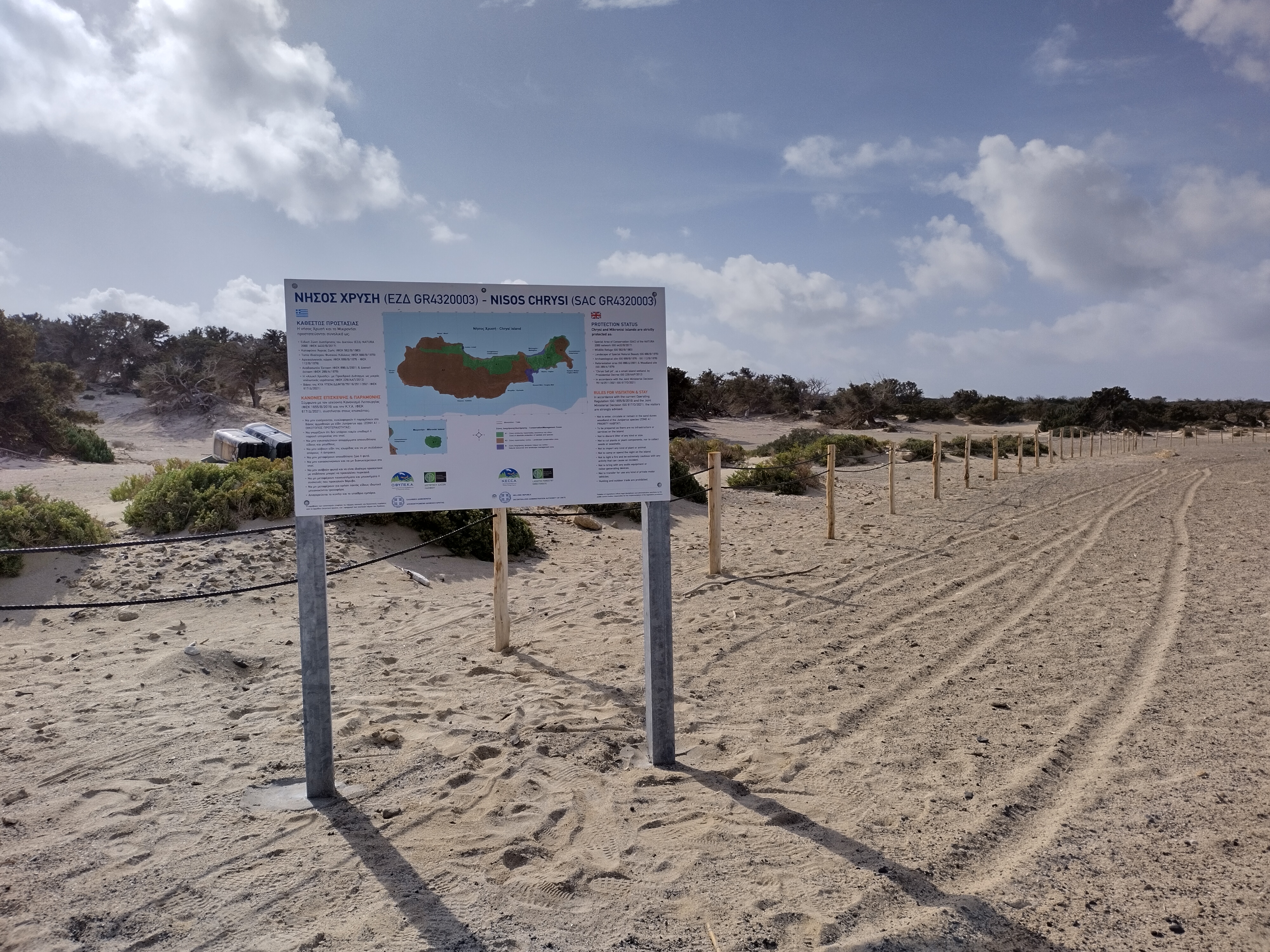 - τοποθετήθηκαν ενημερωτικές πινακίδες για τη πληροφόρηση των επισκεπτών σχετικά με το θεσμικό πλαίσιο που διέπει τις προστατευόμενες περιοχές Χρυσή και Μικρονήσι αλλά και τους κανόνες επίσκεψης και παραμονής σε αυτές.