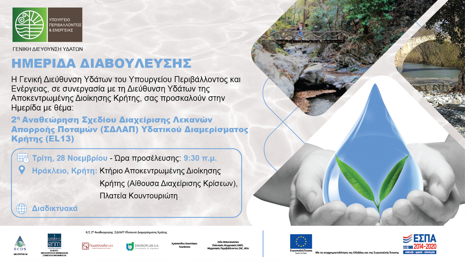 Η Γενική Διεύθυνση Υδάτων του Υπουργείου Περιβάλλοντος και Ενέργειας σε συνεργασία με την Διεύθυνση Υδάτων της Αποκεντρωμένης Διοίκησης Κρήτης, σας προσκαλούν στην Ημερίδα Διαβούλευσης με θέμα: «2η Αναθεώρηση Σχεδίου Διαχείρισης Λεκανών Απορροής Ποταμών (ΣΔΛΑΠ) Υδατικού Διαμερίσματος Κρήτης (EL13)» με στόχο την πληρέστερη ενημέρωση του κοινού και την καταγραφή απόψεων.