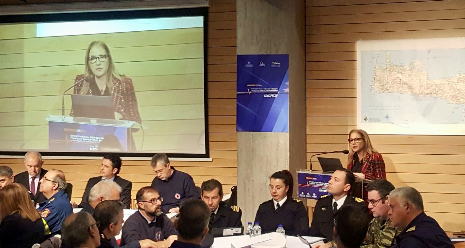 Η Γραμματέας στο χαιρετισμό της κατά την έναρξη της διήμερης διαδικασίας, ανέδειξε τη σημαντικότητα του εγχειρήματος για την ενδυνάμωση της ετοιμότητας των αρμόδιων φορέων στην εφαρμογή ενός καθολικού σχεδίου αντιμετώπισης εκτάκτων αναγκών, στη μείωση της σεισμικής διακινδύνευσης, και στην αποτελεσματική διαχείριση των δυσμενών συνεπειών αυτών των φυσικών καταστροφών. Επεσήμανε ότι, είναι απαραίτητο το σύνολο των εμπλεκόμενων φορέων να συμμορφώνονται με τις υποχρεώσεις που έχουν ως προς τον σχεδιασμό και την ετοιμότητα, όπως αυτά καθορίζονται από το σχετικό θεσμικό και κανονιστικό πλαίσιο, και να δεσμευτούν ως προς την αγαστή και αποτελεσματική συνέργεια τους με σκοπό την ενίσχυση της ασφάλειας του κοινωνικού συνόλου.