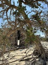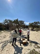 Ο Διευθυντής Ερευνών του Ι.Δ.Ε. Δρ. Δημήτρης Αβτζής και ο Κύριος Ερευνητής Δρ. Φώτης Ξυστράκης του ΕΛ.Γ.Ο. ΔΗΜΗΤΡΑ τοποθέτησαν παγίδες και αισθητήρες σε επιλεγμένες θέσεις και υποκείμενα, ενώ ελήφθησαν φυτικά δείγματα για εργαστηριακό έλεγχο. Στη συνέχεια, θα ακολουθήσει έλεγχος της φυτρωτικότητας και των προβλημάτων που εμφανίζονται στην φυσική αναγέννηση των αρκεύθων. Οι εργασίες πραγματοποιούνται βάσει των προδιαγραφών της σύμβασης και έχοντας εξασφαλίσει όλες τις απαιτούμενες αδειοδοτήσεις από το Υπουργείο Περιβάλλοντος και τις αρμόδιες τοπικές αρχές.